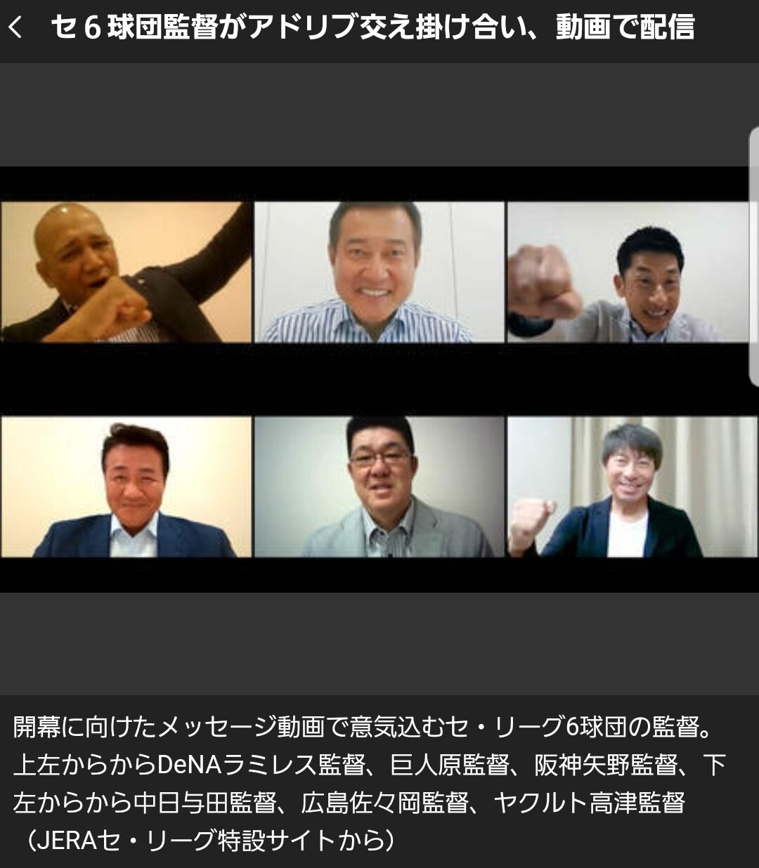 セ・リーグ公式戦のタイトルパートナーの株式会社JERA(東京電力と中部電力の合弁会社)が企画し、セ・リーグ6球団と開幕に向けてのメッセージ動画第2弾を28日、同社公式サイト、NPBの公式サイトなどで配信した。新型コロナウイルスの感染拡大で開幕が延期されていたが6月19日の船出が正式決定。ようやく目指すべき目標が定まった今、セ・リーグの6人の監督がテレビ電話会議で集まり、あらためて力強いメッセージを発し合うことにより、自らが率いるチームを、開幕を待望していたファンを、いよいよ戦闘モードに導く。