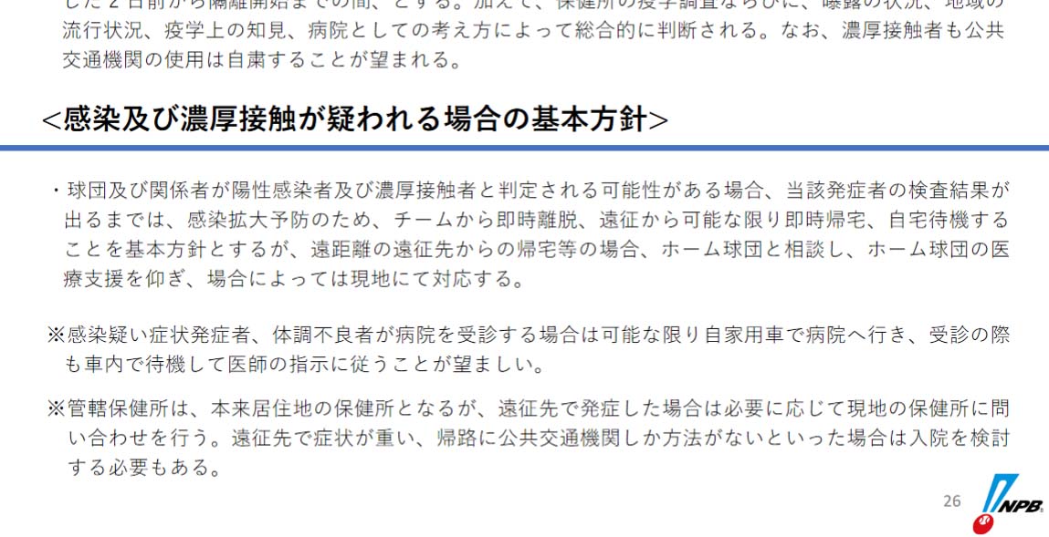 出るまでは、感染拡大予防のため、チームから即時離脱、遠征から可能な限り即時帰宅、自宅待機する