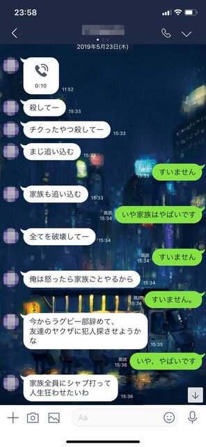 「友達のヤクザに犯人探させようかな」「家族全員にシャブ打って人生狂わせたいわ」などというLINEを送った。