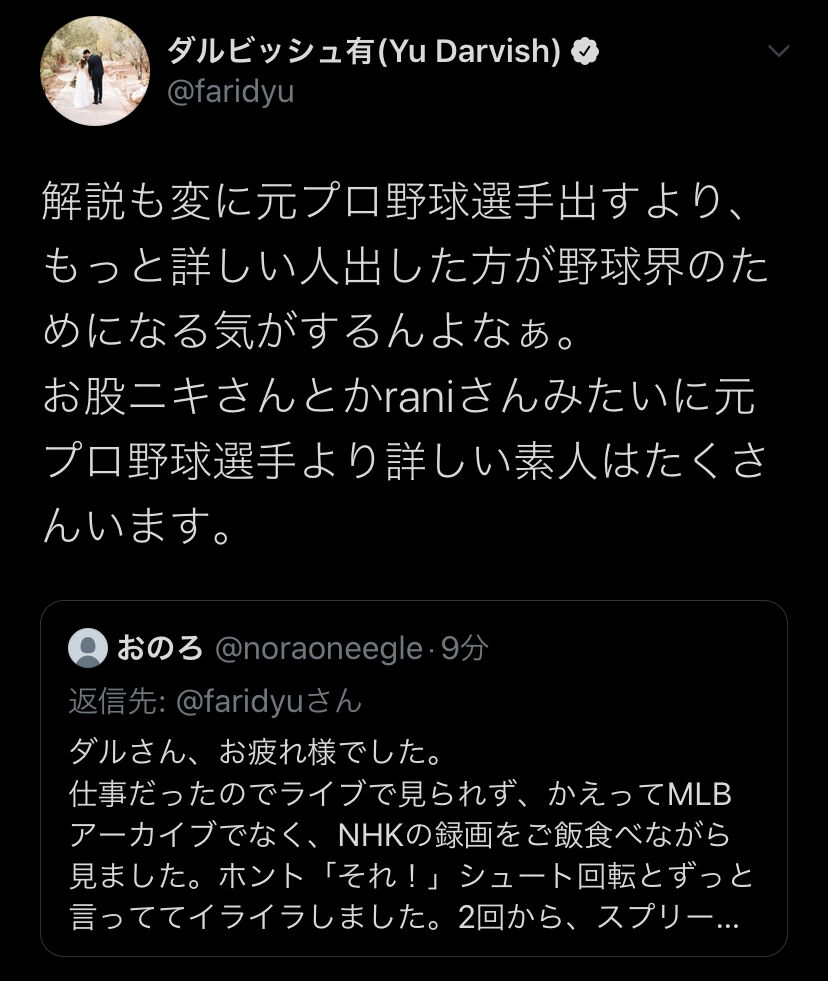【続報】ダルが提案「解説者には元プロ選手でなくもっと詳しい素人を起用したほうがいい」