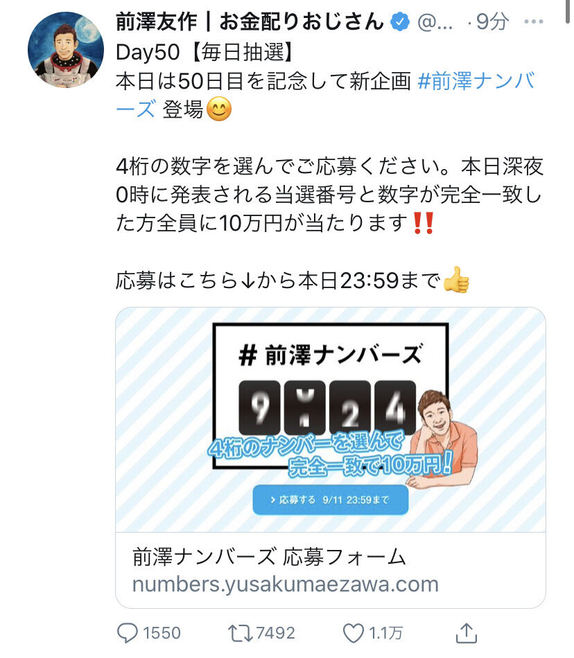 本日は50日目を記念して新企画 #前澤ナンバーズ 登場😊4桁の数字を選んでご応募ください。本日深夜0時に発表される当選番号と数字が完全一致した方全員に10万円が当たります‼️