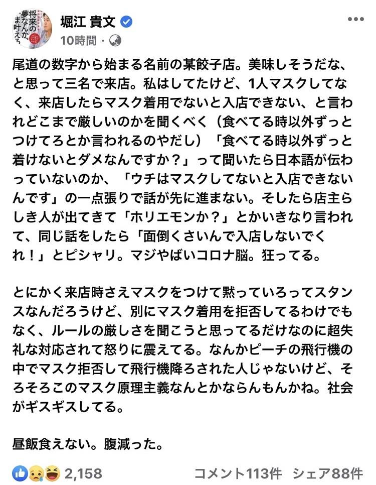 ホリエモン、餃子店に行くもマスク着用について店と揉める