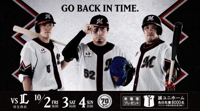なお、10月2日(金)~4日(日)は球団設立70周年を記念して日本一に輝いた4度のシーズンに焦点を当てる企画「70周年チャンピオンシリーズ」を開催。2005年の日本一にスポットを当てたイベントや、来場者先着5,000名様へのユニホーム配布プレゼントを予定しています。