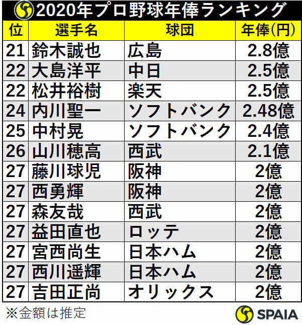 ●中村晃2.4億、C.ルメール2.2億、山川穂高2.1億