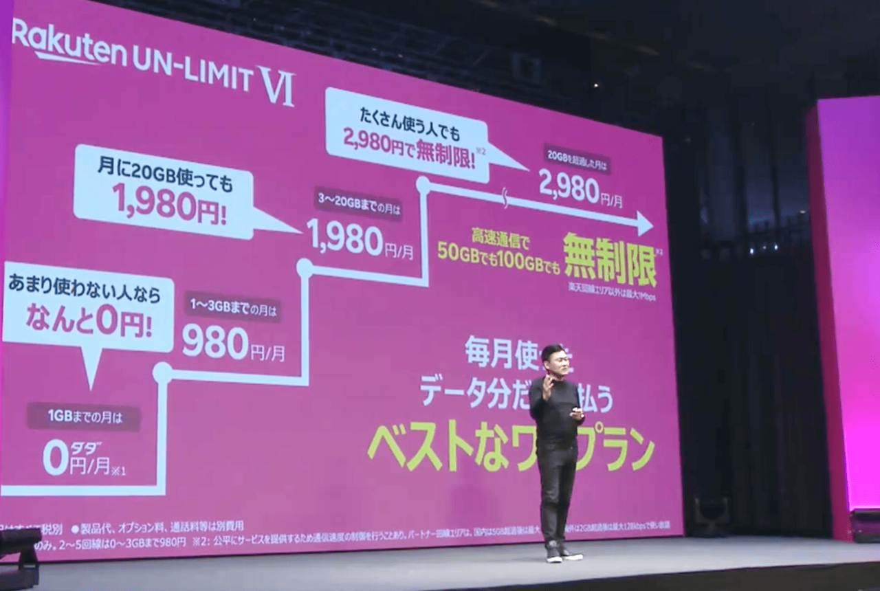 楽天モバイル新料金プラン発表 三木谷氏「利用量1GB未満なら無料でいい」