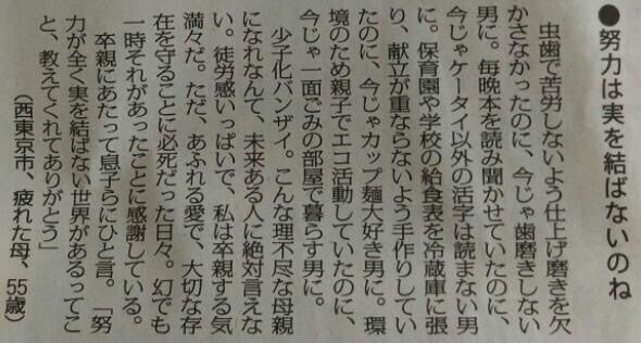 【悲報】母親「息子へ。努力が全く実を結ばない世界があるって事を教えてくれてありがとう」