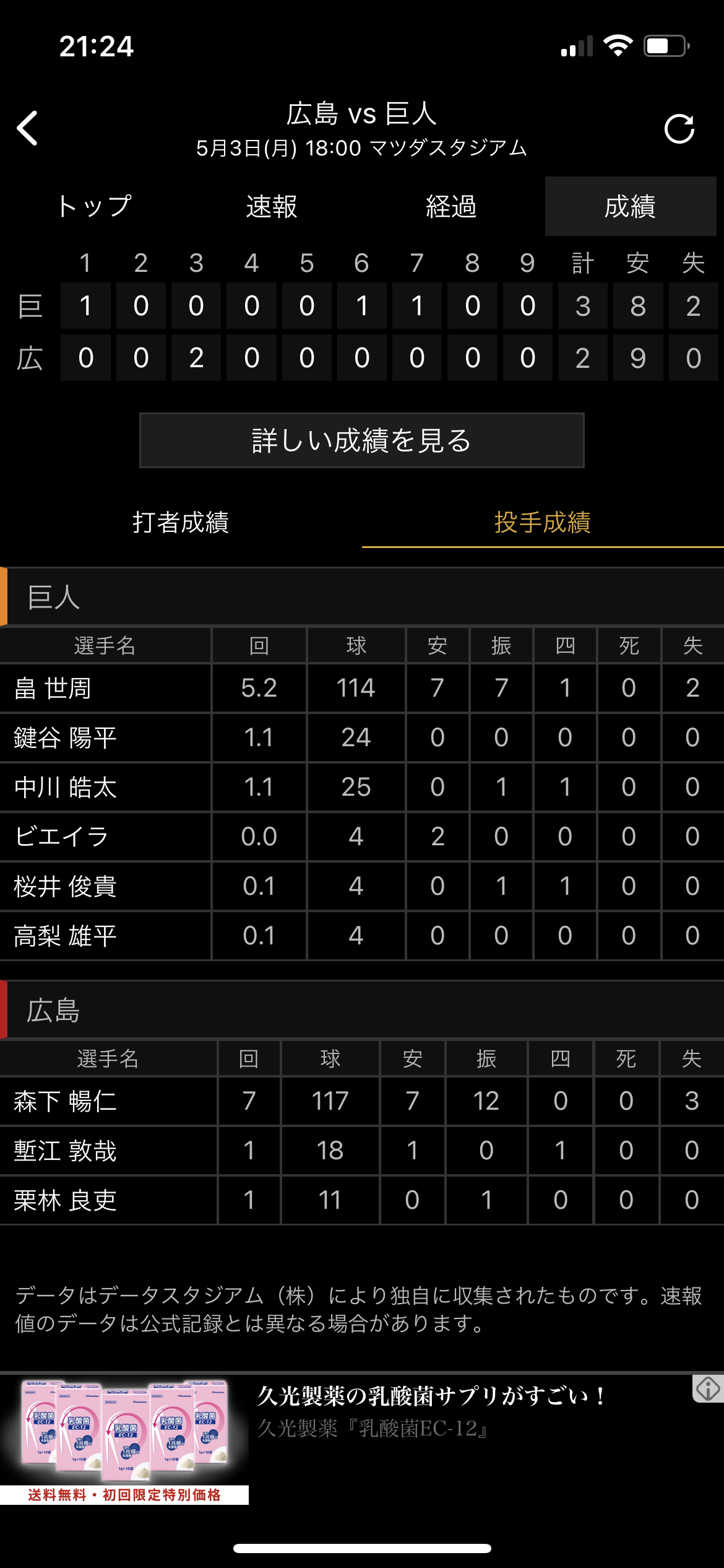 1点リードの9回、8回から3番手で登板していた中川がイニングまたぎでマウンドへ。安部を二ゴロに仕留めたところで4番手ビエイラにバトンを託した。