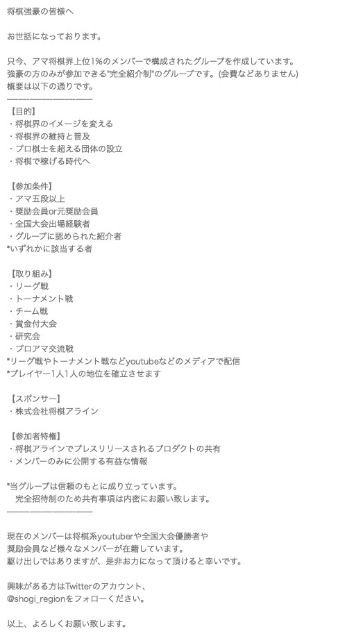 元奨励会アマチュア最強「選抜された将棋の強豪だけが参加できる"完全招待制"のグループを作成しました。」