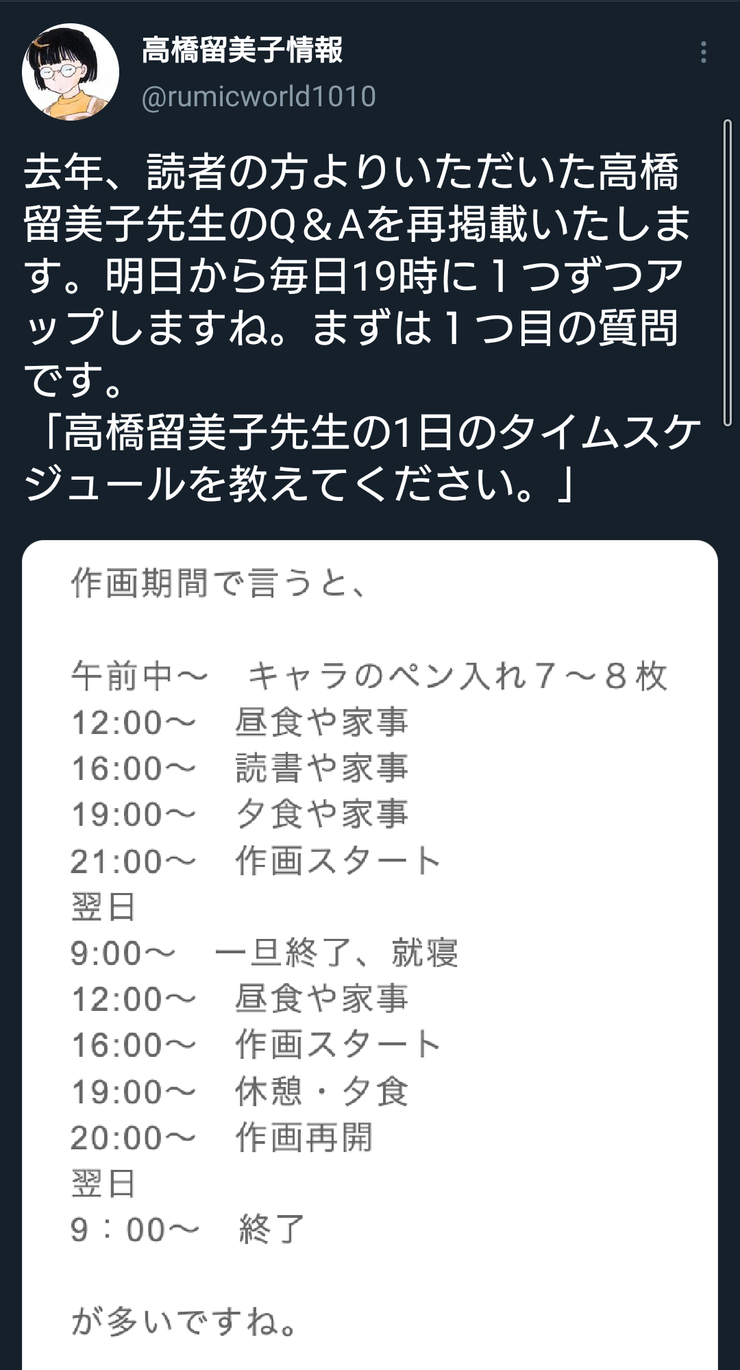 【画像】高橋留美子の一日のスケジュールwwwwwww