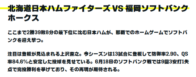 ここまで2勝39敗8分の最下位に沈む日本ハムが、那覇でのホームゲームでソフトバンクを迎え撃つ。