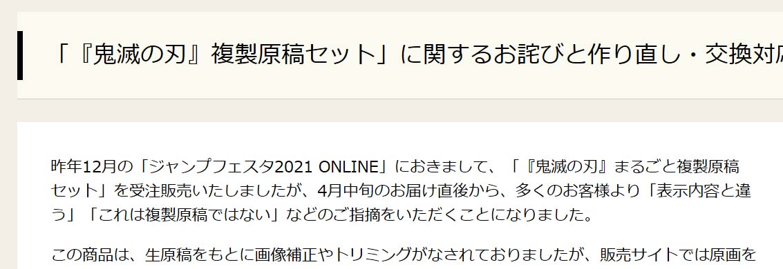 「『鬼滅の刃』複製原稿セット」に関するお詫びと作り直し・交換対応についてのお知らせ