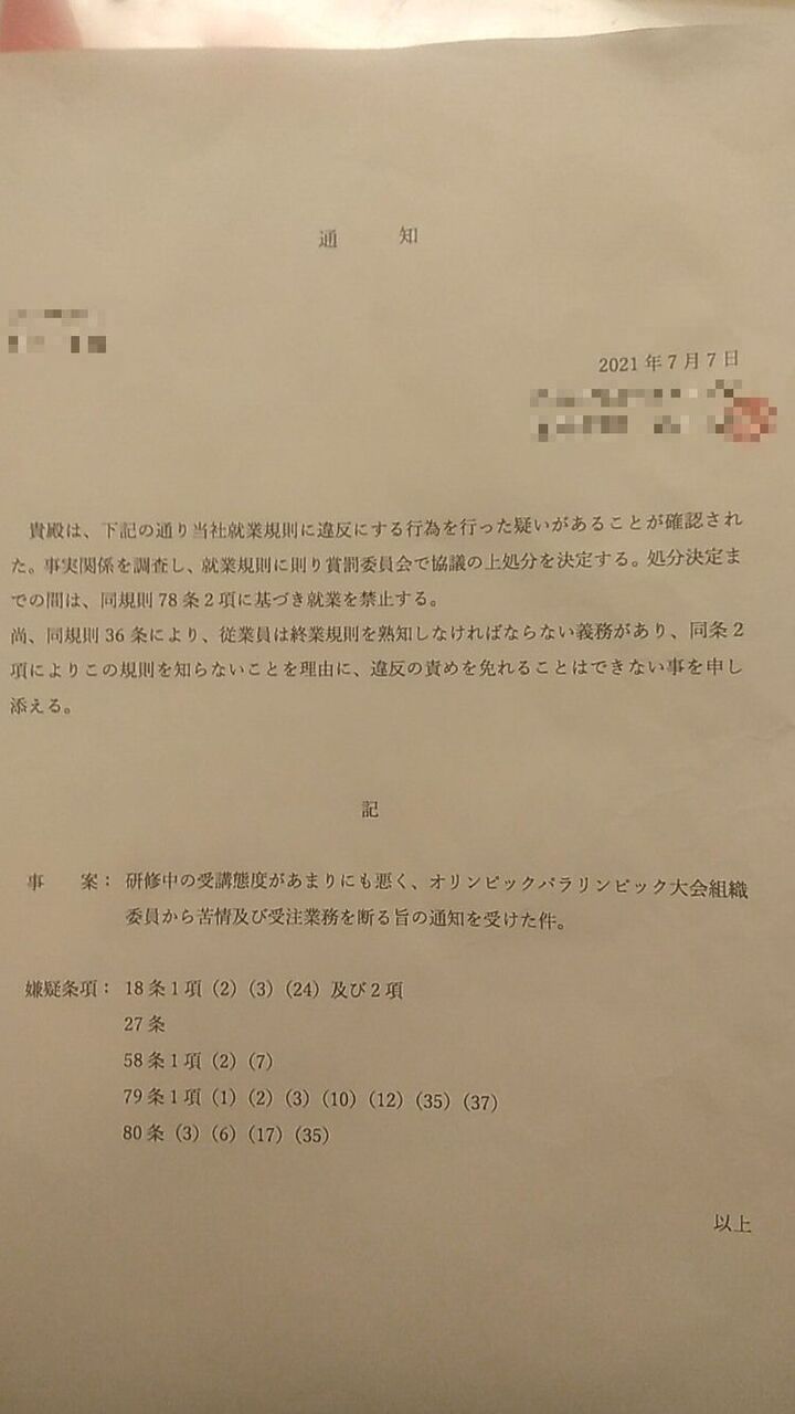 通知も渡され、内容には「研修中の受講態度があまりにも悪く、オリンピック・パラリンピック大会組織委員から苦情及び受注業務を断る旨の通知を受けた」とある。