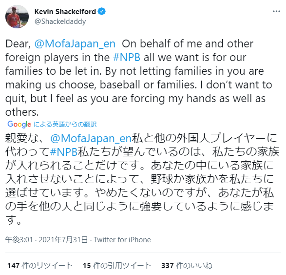 シャッケルフォードのツイートは「私は日本が大好きです。ここはアメージングな国です。他の人たちと同様、私も愛する人たちにこの国の美しさを広めたいと思っています。辞めたくありませんが、もし家族よりも野球を私に選ばせようとするなら、私はいつでも家族を選びます!」と日本への愛情を訴えるもの。家族の来日を心待ちにする心情が読み取れる。