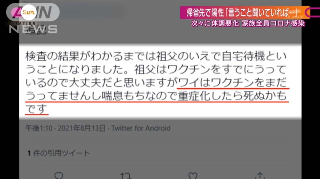 帰省先で家族4人感染「おとなしく政府の言うこと聞いてれば」「ワイは死ぬかもです」