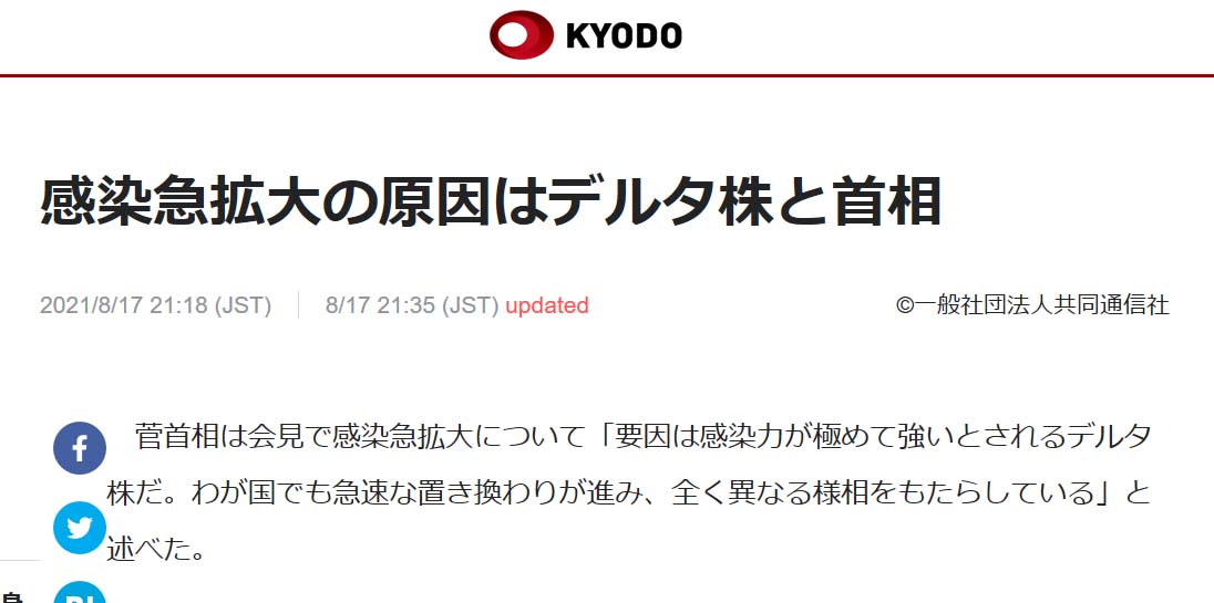 共同通信「感染急拡大の原因はデルタ株と首相」