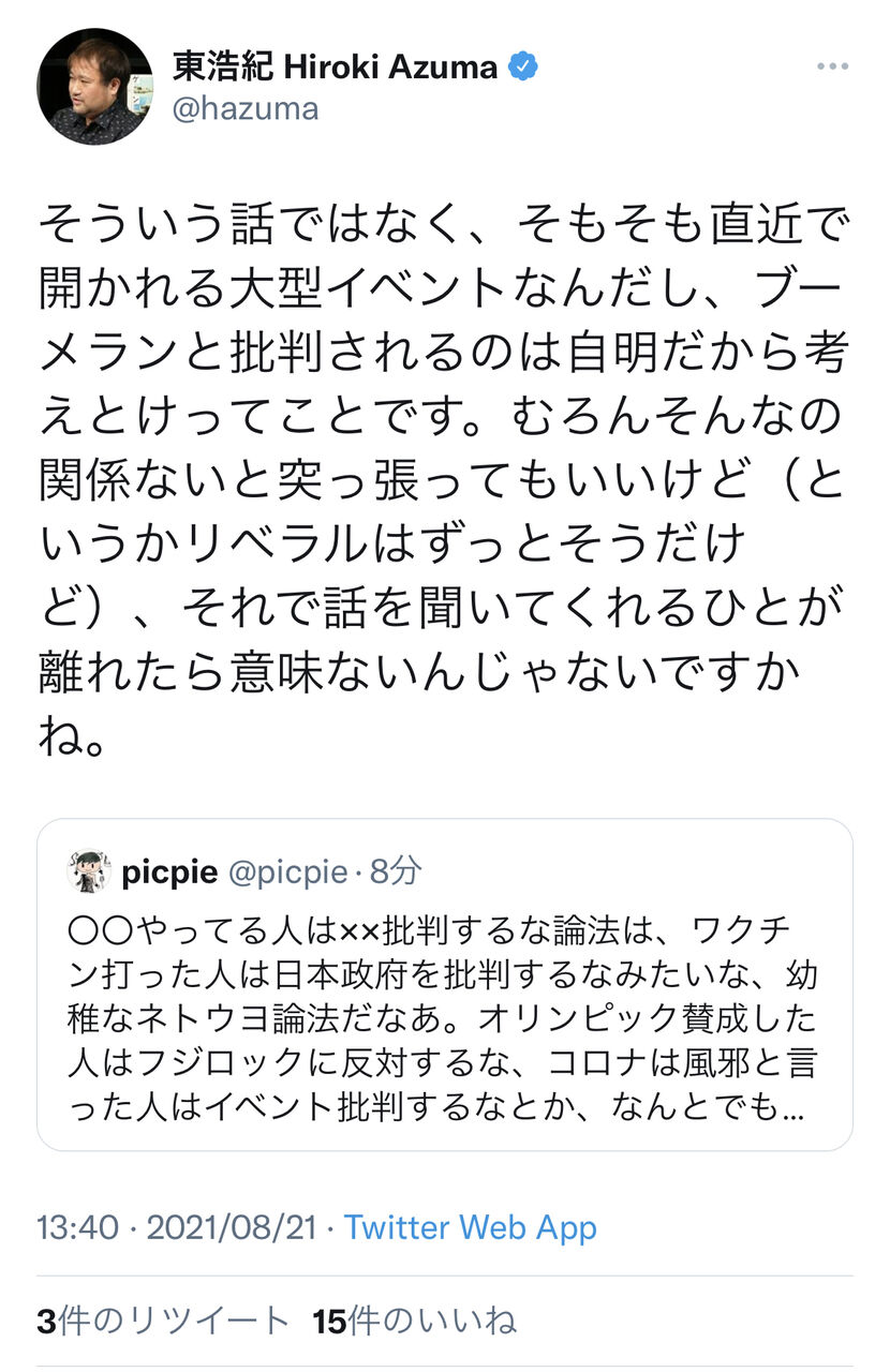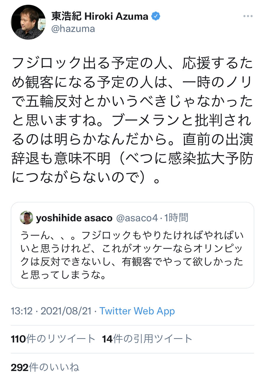 東浩紀「フジロック出る人や観客は五輪反対とか言うべきじゃなかった」