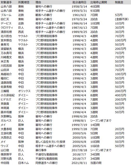 ※NPBウェブサイトに記載された「リーグ略史」および報道からまとめたもの。「リーグ略史」には清原の処分が記載されていないなど、すべての処分を網羅していない。このため上表も出場停止処分のすべてを網羅していることは保証しない。