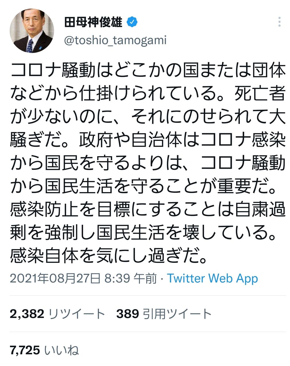 政府や自治体はコロナ感染から国民を守るよりは、コロナ騒動から国民生活を守ることが重要だ。感染防止を目標にすることは自粛過剰を強制し国民生活を壊している。感染自体を気にし過ぎだ。