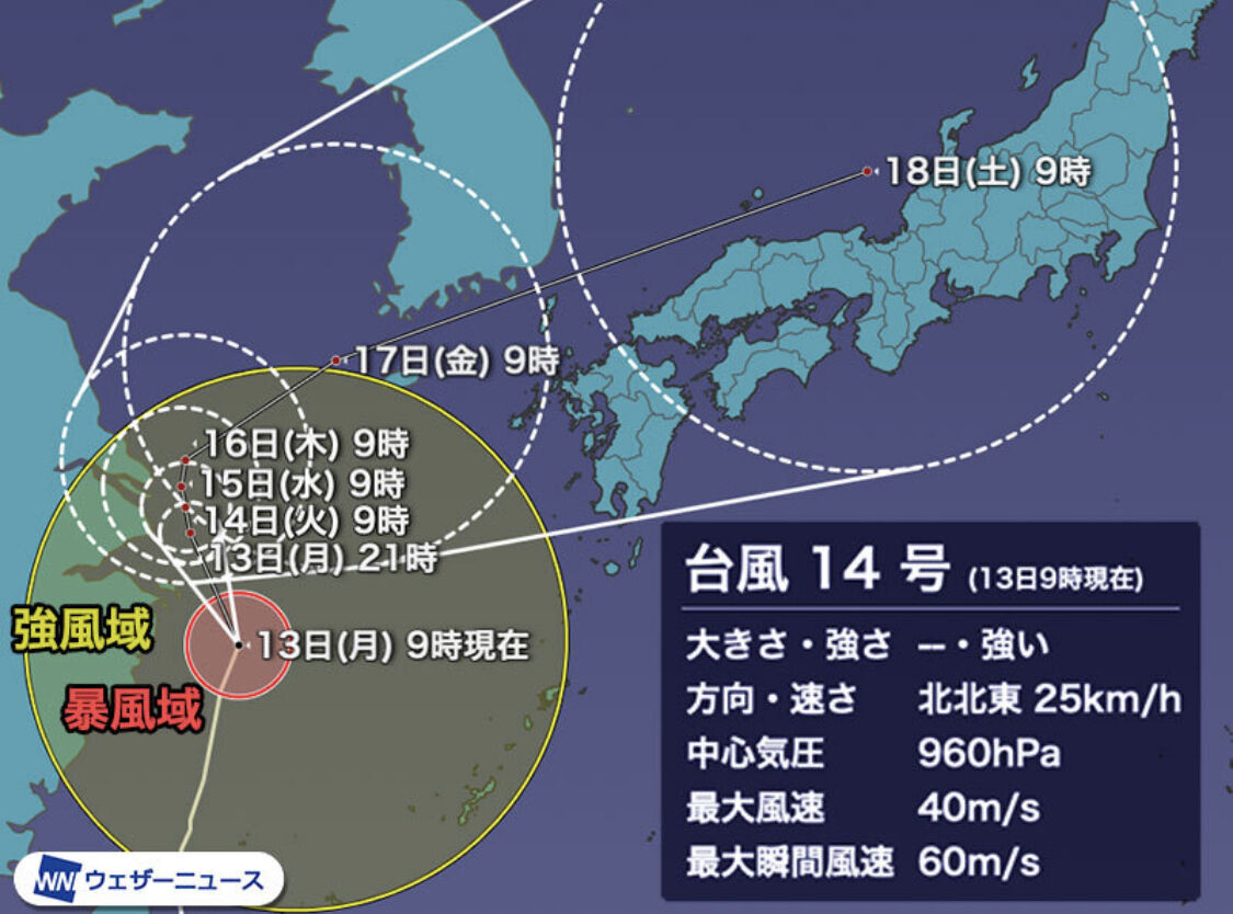 【大悲報】台風14号さん、急旋回して東へ移動。日本横断へ