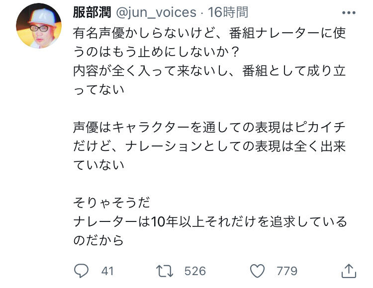 【悲報】大物ナレーター「アニメ声優は番組ナレーションの仕事やめてくれ!」