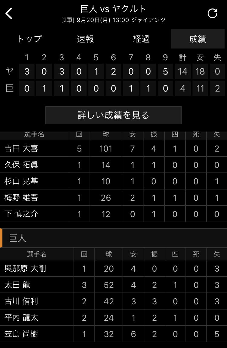 【二軍】9月20日 ヤクルト14 – 4巨人