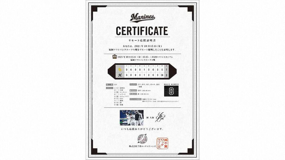 ロッテ、リモート応援証明書に優勝マジックの記載開始