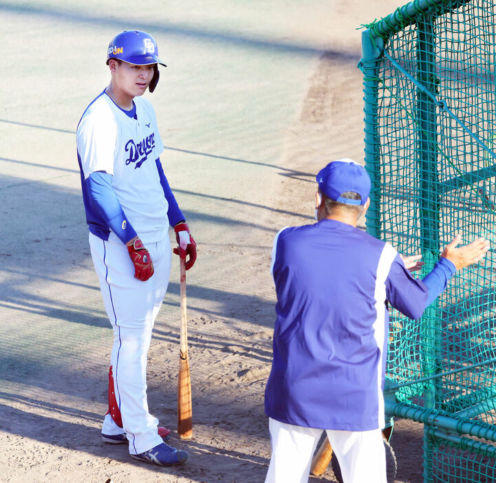 そのそばで見守ったのは、立浪監督から「石川を育てて欲しい」と託された中村紀洋打撃コーチ。同コーチも「今日は教えず、見るだけだったんですけど・・・」と言いながら、気づけば石川昂に身ぶり手ぶりで“ノリ流”アドバイス。