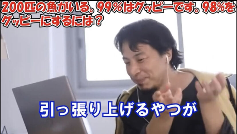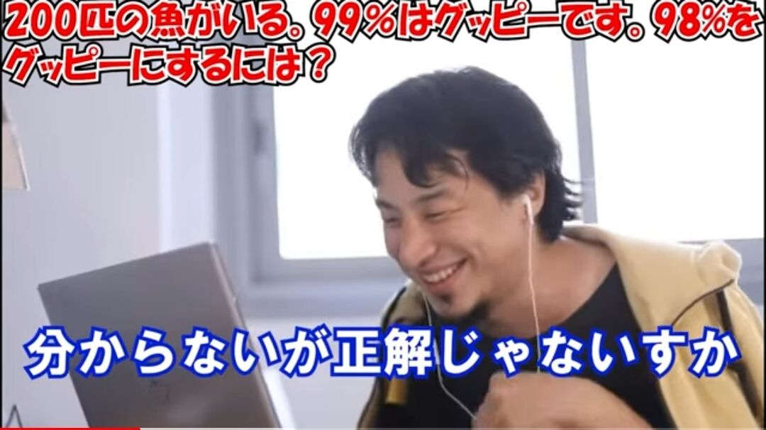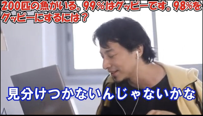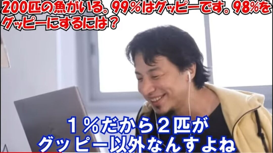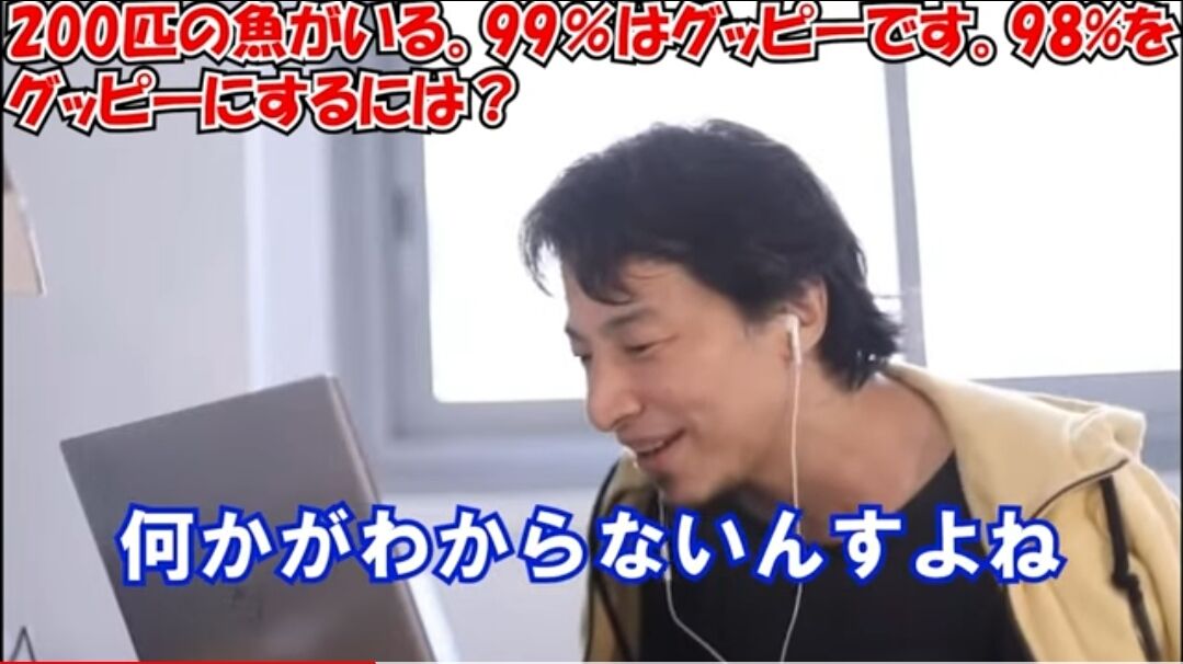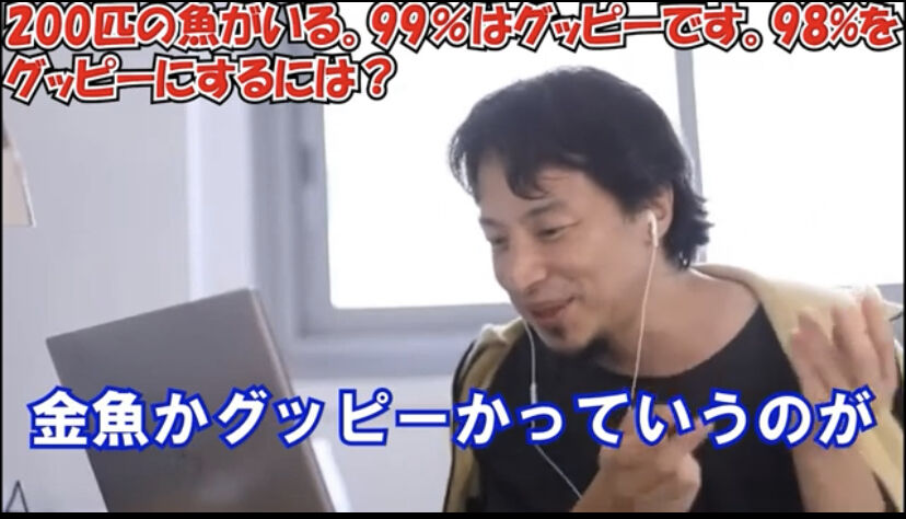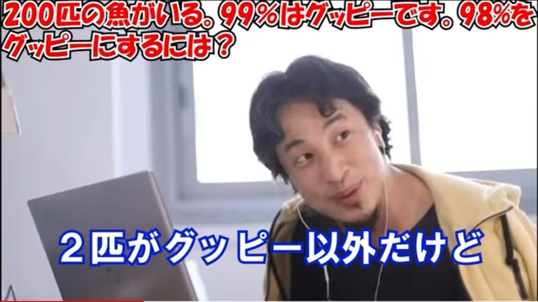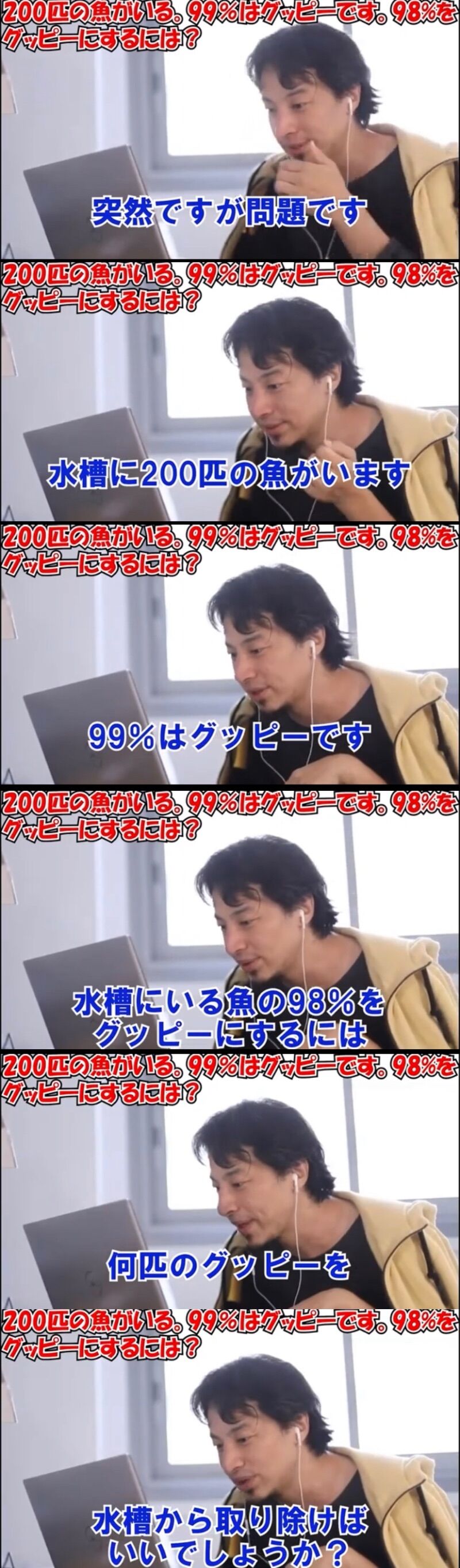 質問者「突然ですが問題です。 水槽に200匹の魚がいます。99%はグッピーです。 水槽にいる魚の98%をグッピーにするには、何匹のグッピーを水槽から取り除けばいいでしょうか?」