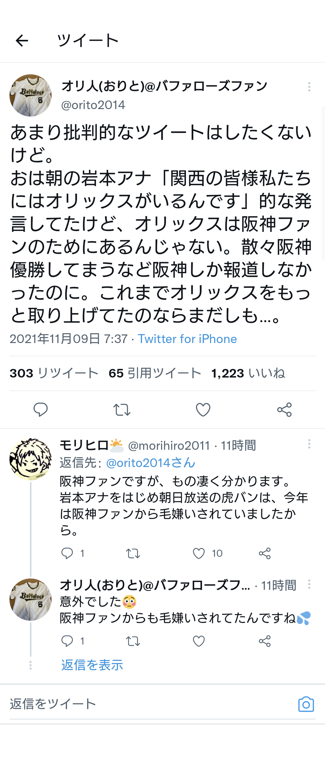 【悲報】ABC岩本アナ「関西の皆さん、私達にはオリックスがいます!」