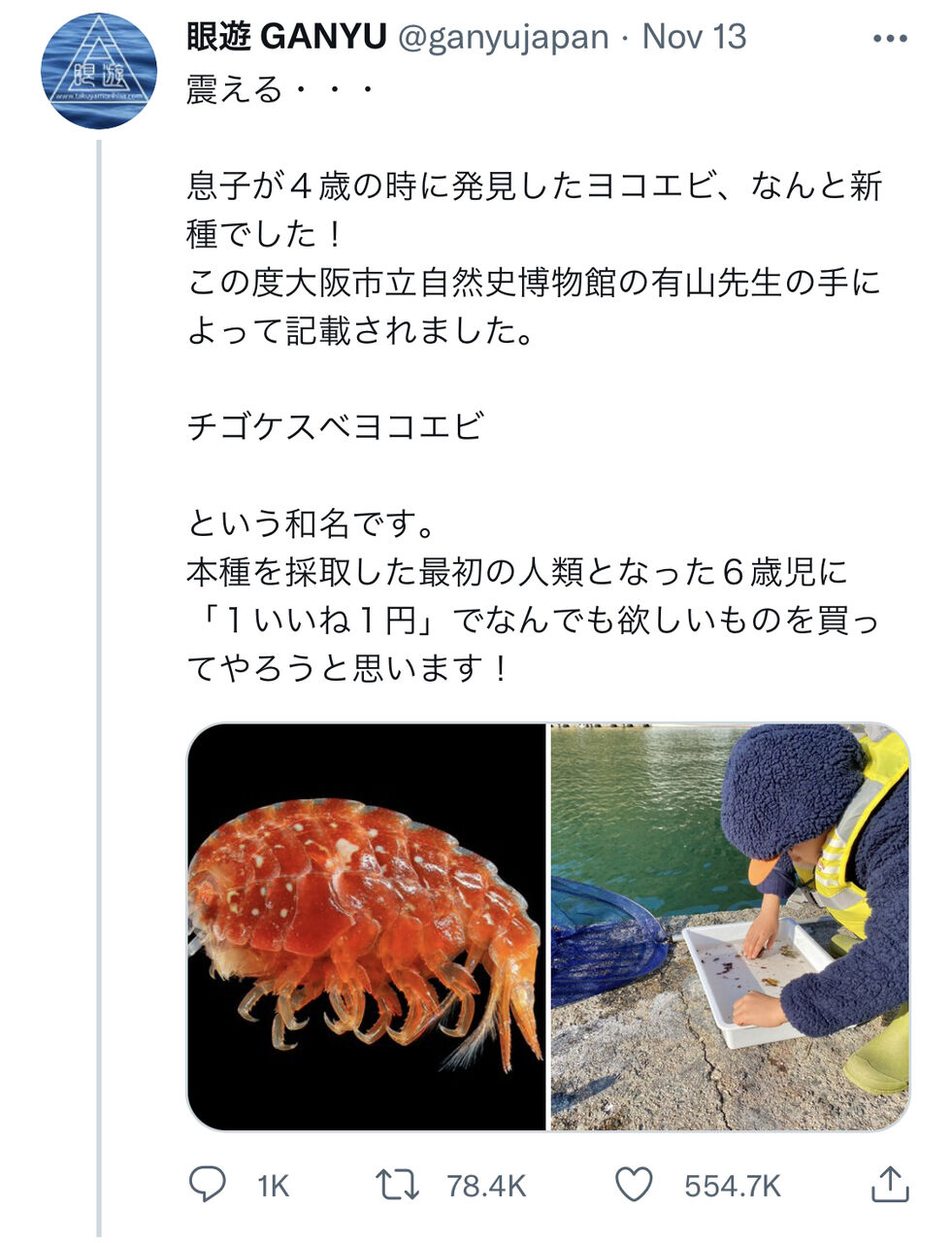 新種「チゴケスベヨコエビ」を発見した6歳児、46万円相当の品をゲット