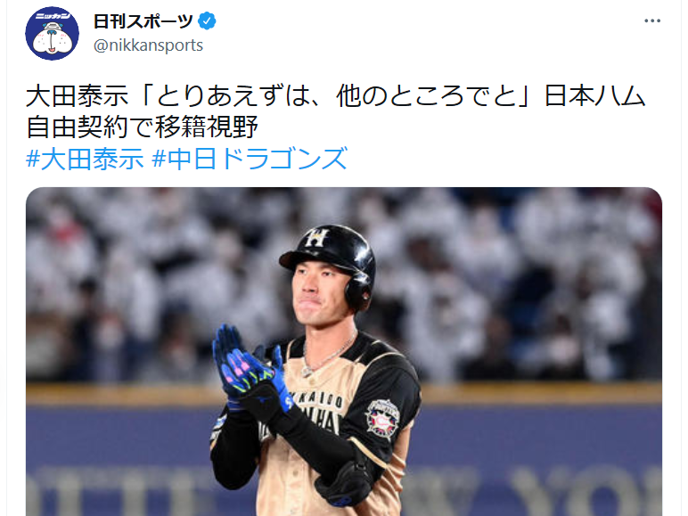 日刊スポーツさん、大田泰示の獲得先を漏らしてしまう??wwwwwww