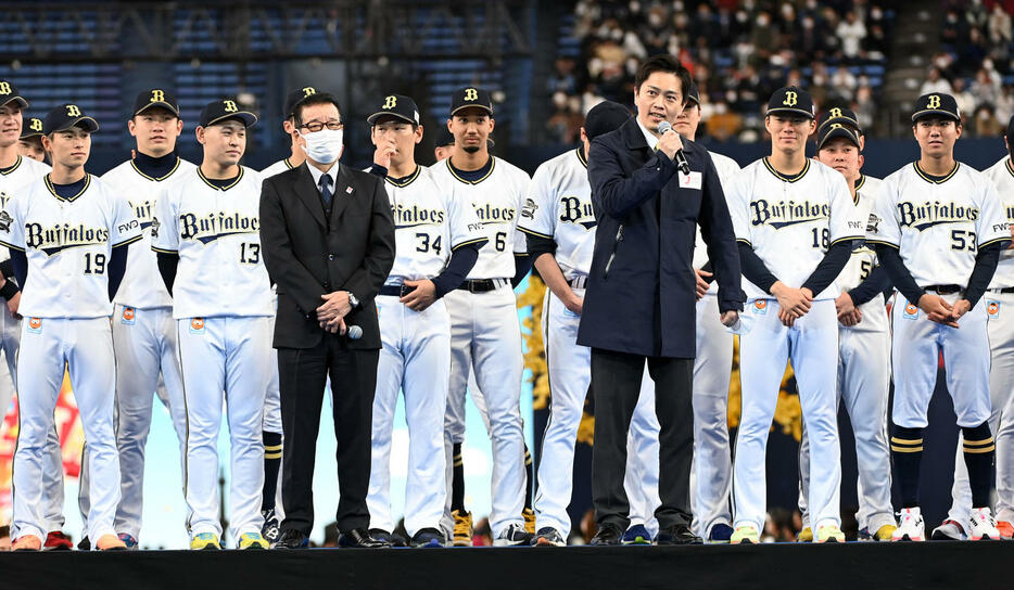 大阪府の吉村洋文知事が、オリックスナインをねぎらった。大阪市の松井一郎市長と「Bs Fan-Festa2021 supported by CRTM」に出席。ステージに上がり「本当に強いですね。強いだけでなく、面白いです。日本シリーズも見ていましたが、初戦のサヨナラ勝ちでは飛び上がりました」と、第1戦を回想。さらに「T-岡田選手にお願いがあります。サイン入りバットをいただいていたのに、なくしてしまいました。またいただけたら。請求は大阪市にお願い致します」とジョークを交えておねだりも。