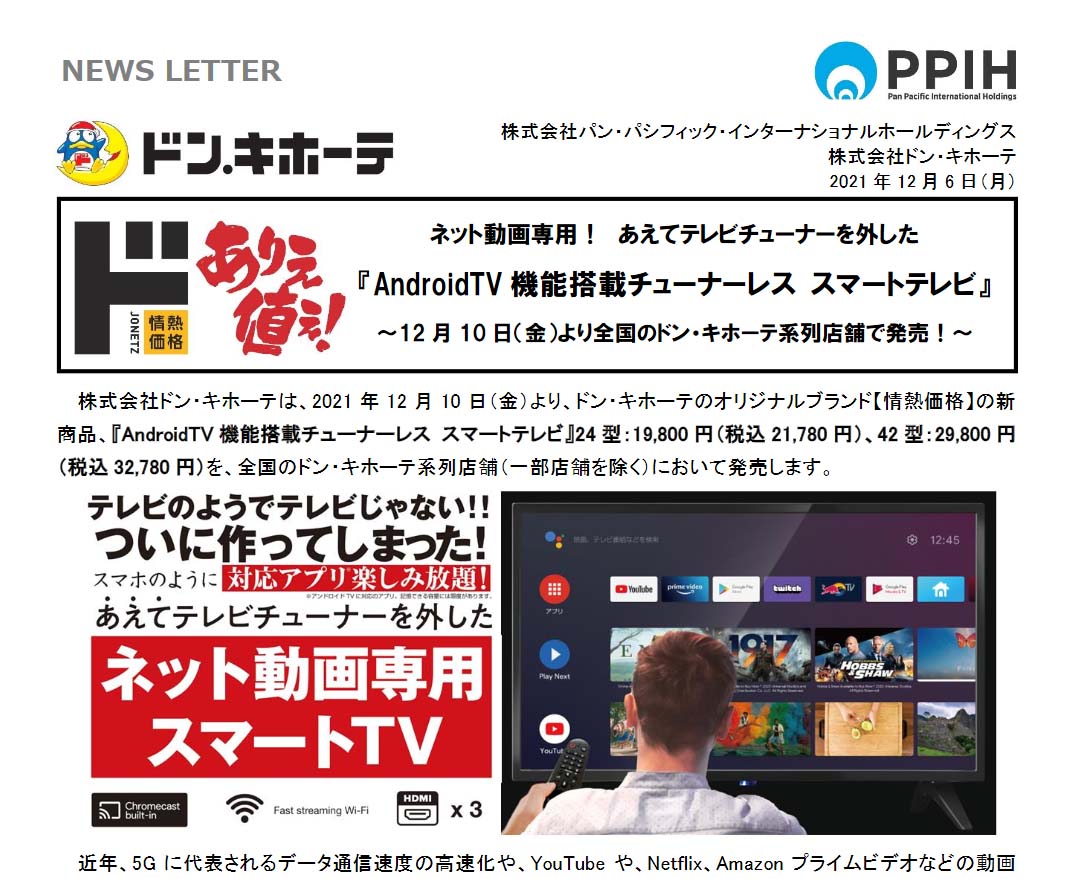 株式会社ドン・キホーテは、2021 年 12 月 10 日(金)より、ドン・キホーテのオリジナルブランド【情熱価格】の新商品、『AndroidTV 機能搭載チューナーレス スマートテレビ』24 型:19,800 円(税込 21,780 円)、42 型:29,800 円(税込 32,780 円)を、全国のドン・キホーテ系列店舗(一部店舗を除く)において発売します。