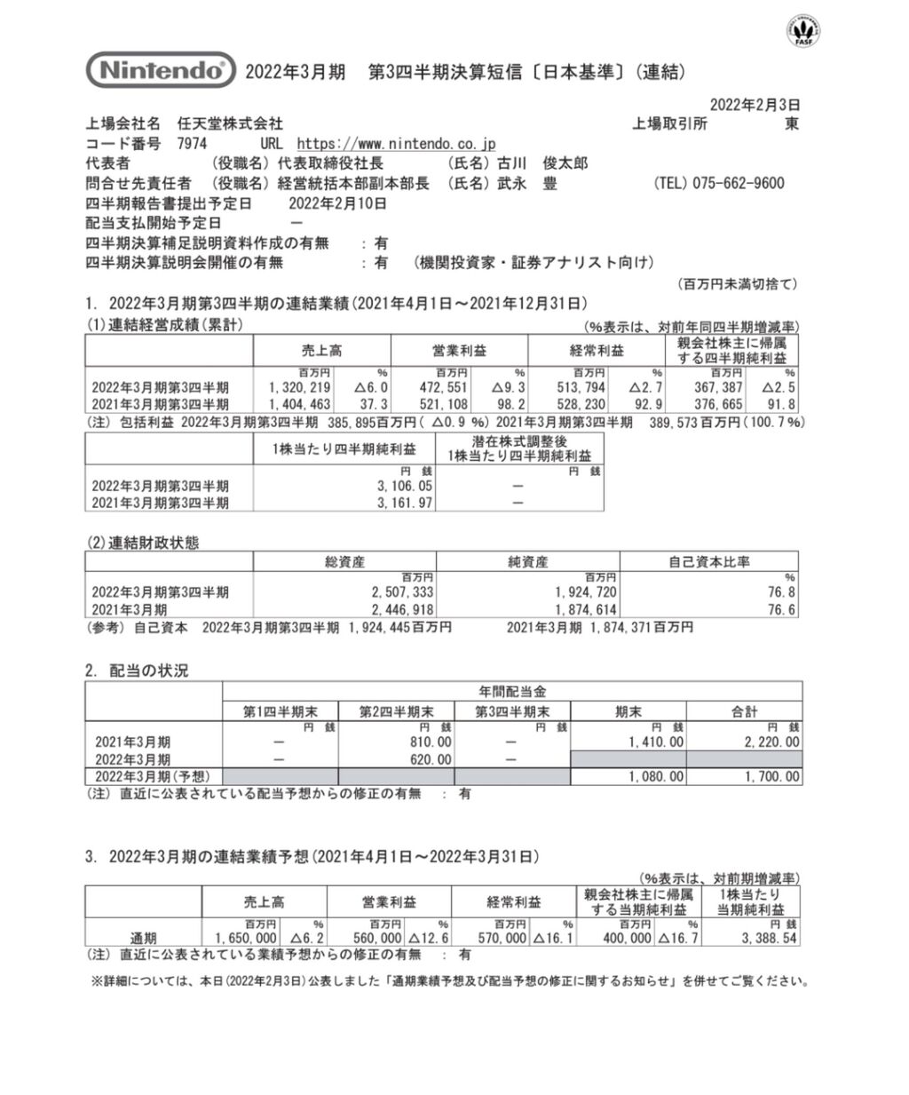 任天堂は2月3日、2021年度Q3の連結業績を発表した。