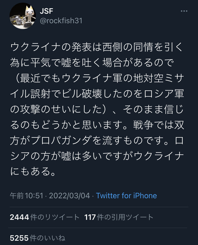 【悲報】Twitter軍師「ウクライナは誤射してビル壊したのをロシアのせいにしてる。ソースは俺。」