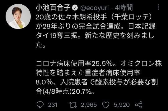 【悲報】小池百合子都知事、佐々木朗希を祝福して炎上