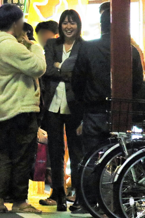 朝の3時をまわっても何やら熱が冷めやらない様子で店を後にした集団は、そのまま路肩で話し始める。いつも通りの上下黒姿にベージュのストールを垂らしているのは斎藤工(38才)。大口を開けてケラケラと声を立てて笑っていたのはパンツスーツで会社員風の長澤まさみ(32才)だった。
