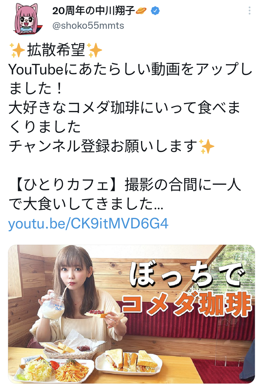 YouTuber中川翔子「一人でコメダ珈琲でドカ食いした」←なら誰が撮ってるんだ?