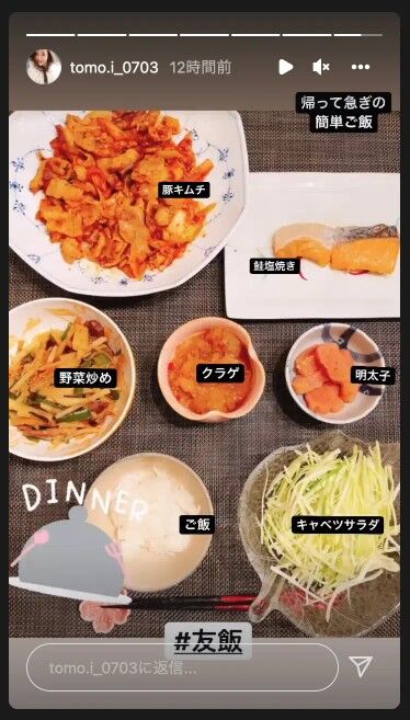 この日は、パーティーに参加したことを報告し、モデルでタレントのMattとのツーショットをストーリーズで披露。続けて「帰って急ぎの簡単ご飯」と帰宅してから急いで料理したことを明かし、豚キムチ、鮭塩焼き、野菜炒め、クラゲ、明太子、ご飯、キャベツサラダが並んだ食卓の写真を投稿した。