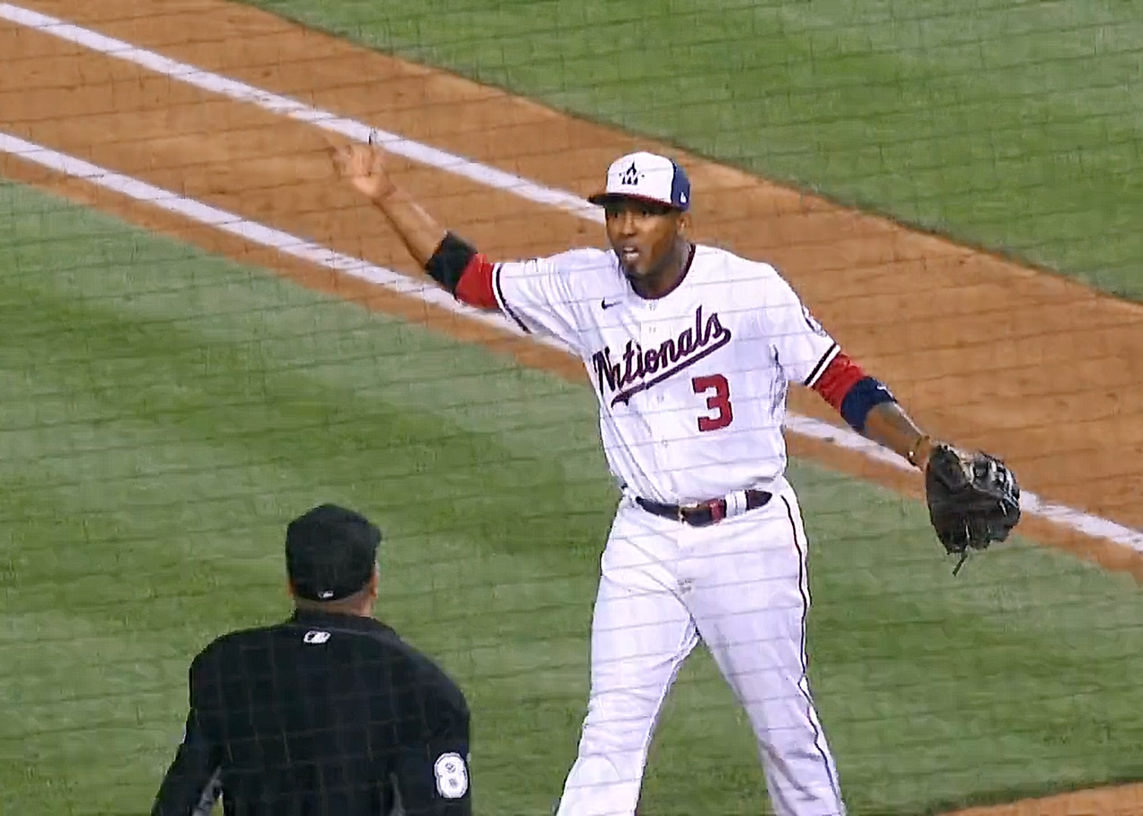 Nationals shortstop Alcides Escobar and center fielder Victor Robles were not happy after Thairo Estrada attempted to steal second base and score on Brandon Crawford’s single in the top of the ninth inning