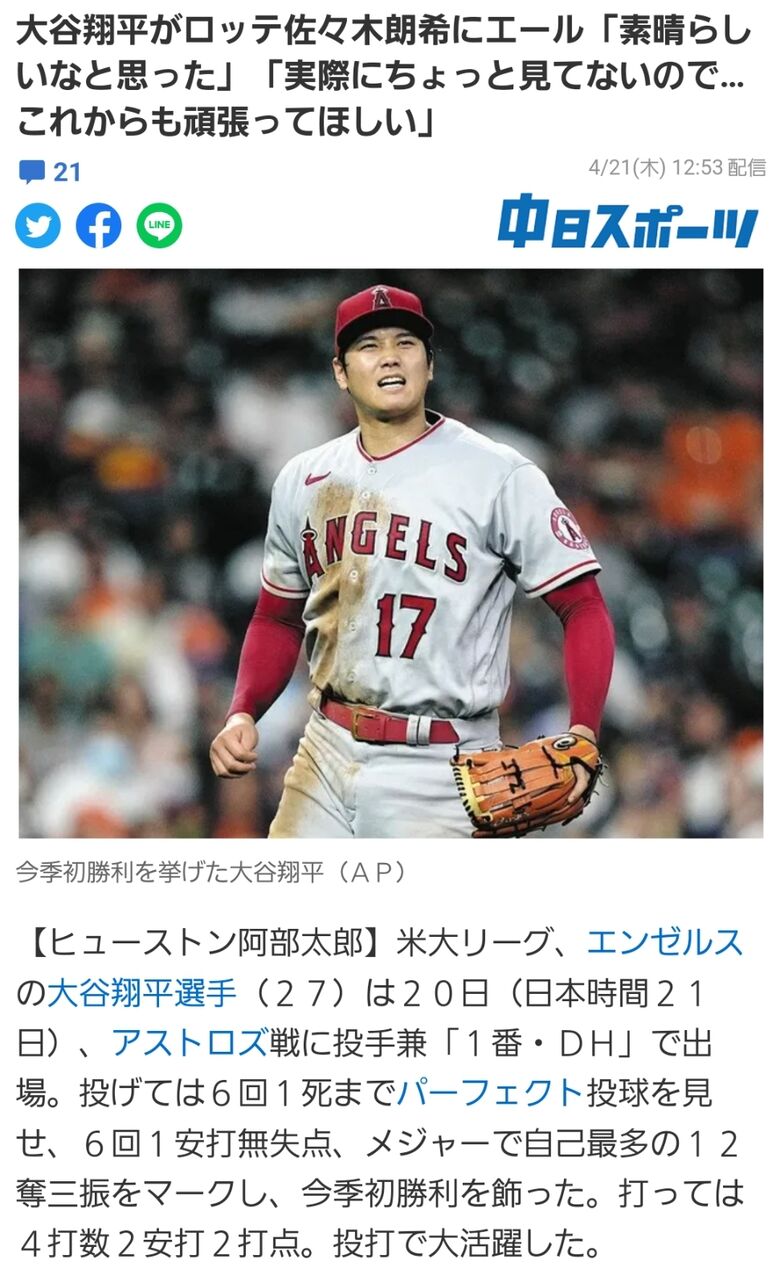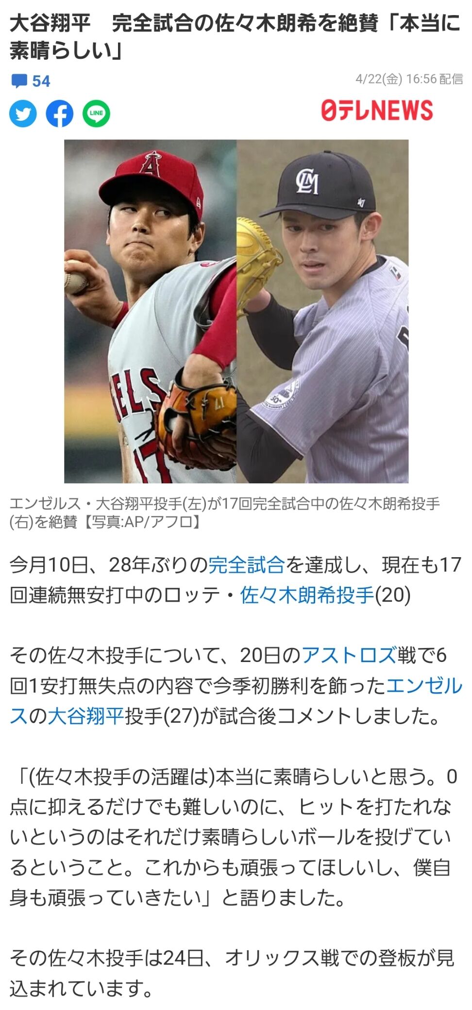 記者「大谷さん!佐々木の完全試合どうでした!?」大谷「見てないけど素晴らしいと思うよ」