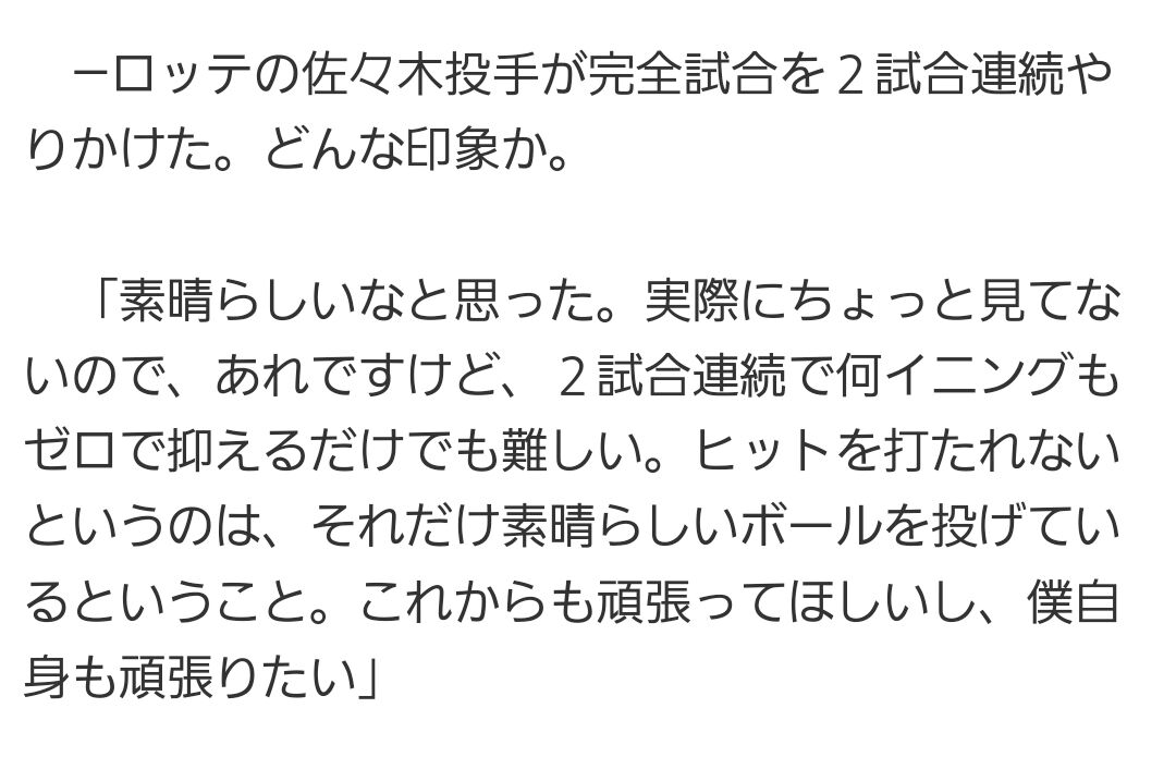 「(佐々木投手の活躍は)本当に素晴らしいと思う。0点に抑えるだけでも難しいのに、ヒットを打たれないというのはそれだけ素晴らしいボールを投げているということ。これからも頑張ってほしいし、僕自身も頑張っていきたい」と語りました。