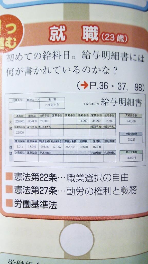 教科書「初めての給料日。明細には何て書かれているのかな?」