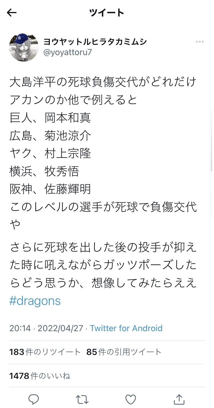 【悲報】中日ファン「大島は岡本菊池村上牧佐藤クラスの選手。死球でキレるのは当然。」