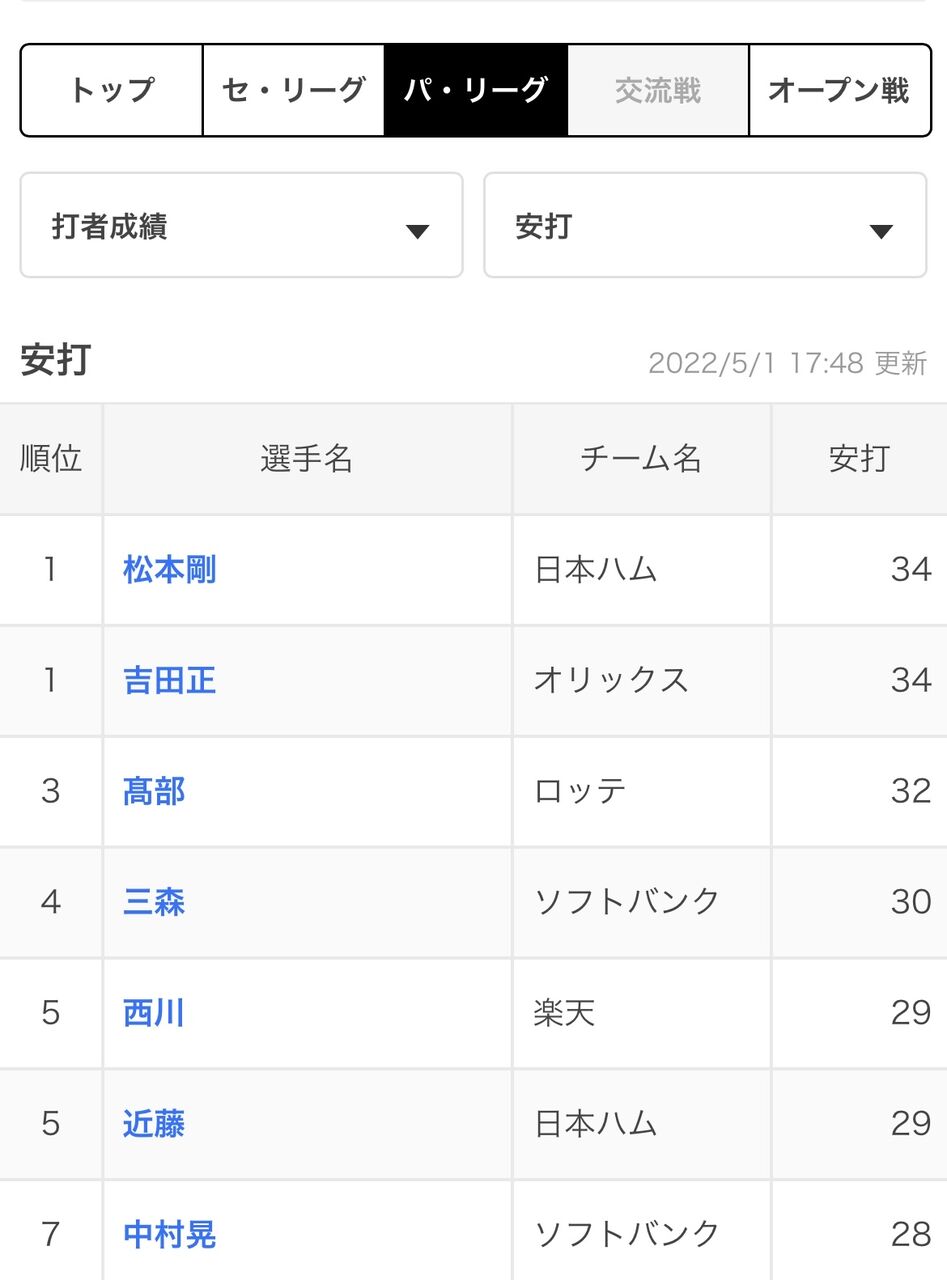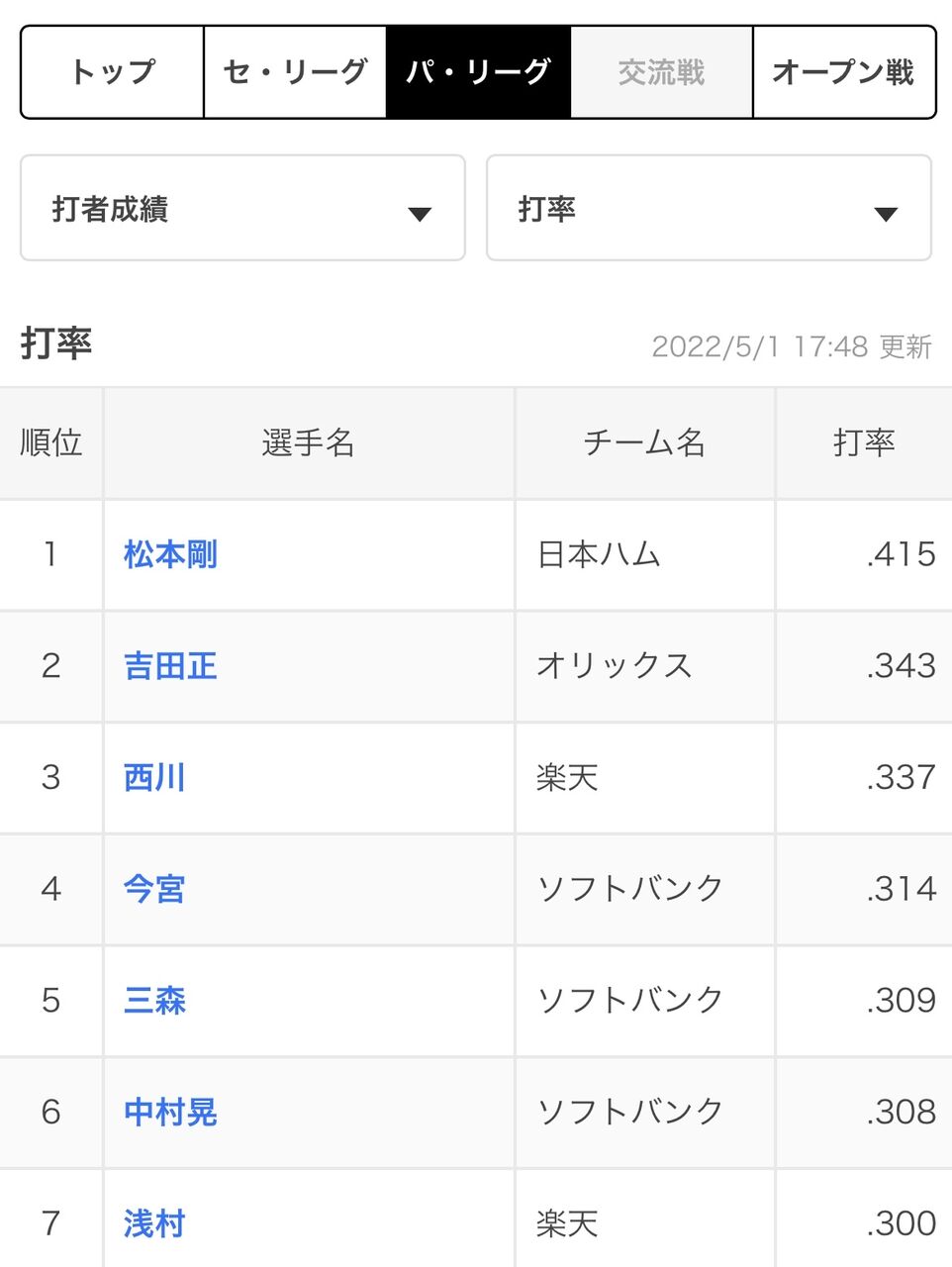 【悲報】パリーグ、謎の選手が2位に大差をつけて首位打者に君臨してしまう