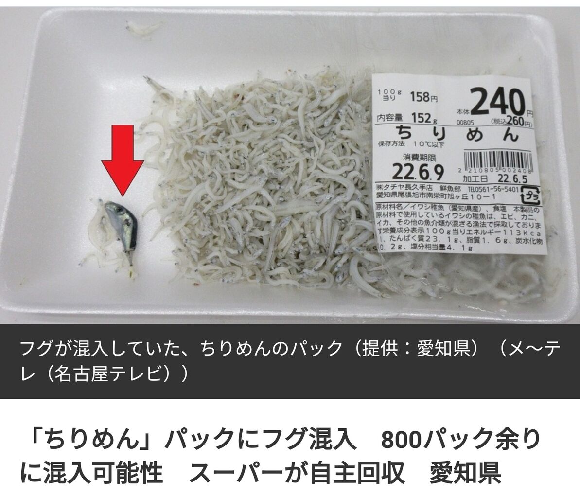 ちりめんパックにフグ混入 お前らが想像してる1.5倍くらいにはガッツリ混入