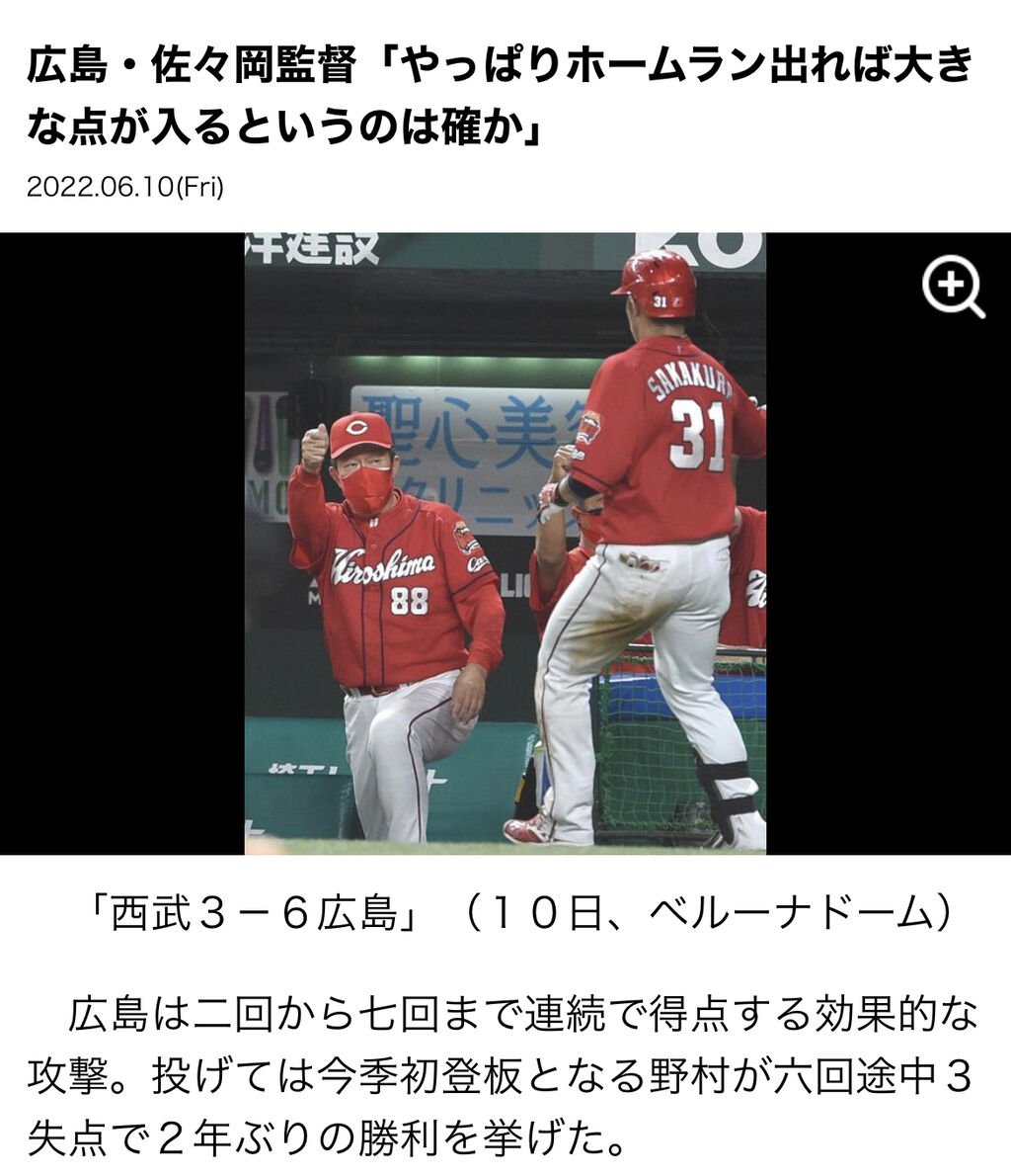 広島・佐々岡監督「やっぱりホームラン出れば大きな点が入るというのは確か」