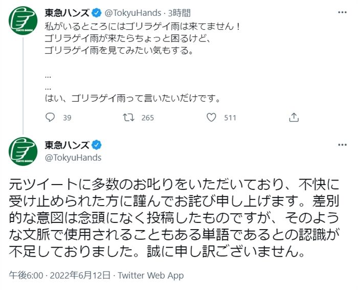東急ハンズ、「ゴリラゲイ雨」とツイートして謝罪