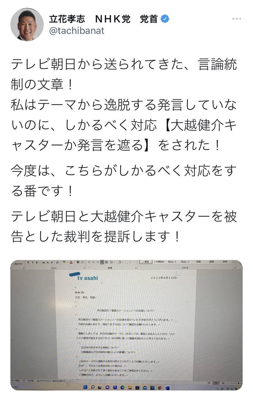 【速報】NHK党立花、報道ステーションで話を遮られたことに腹を立てテレ朝と司会の大越を提訴