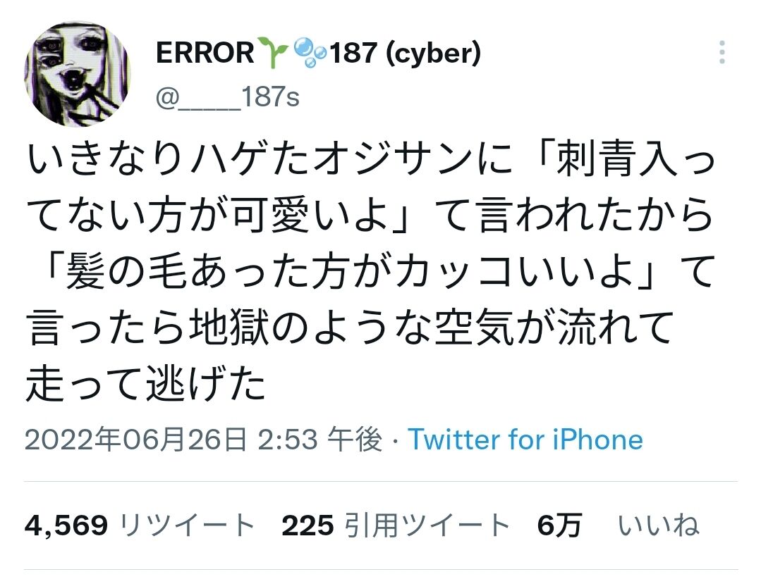 【悲報】おじさん「刺青ないほうがかわいいよ」美女「髪の毛あった方がかっこいいよ」